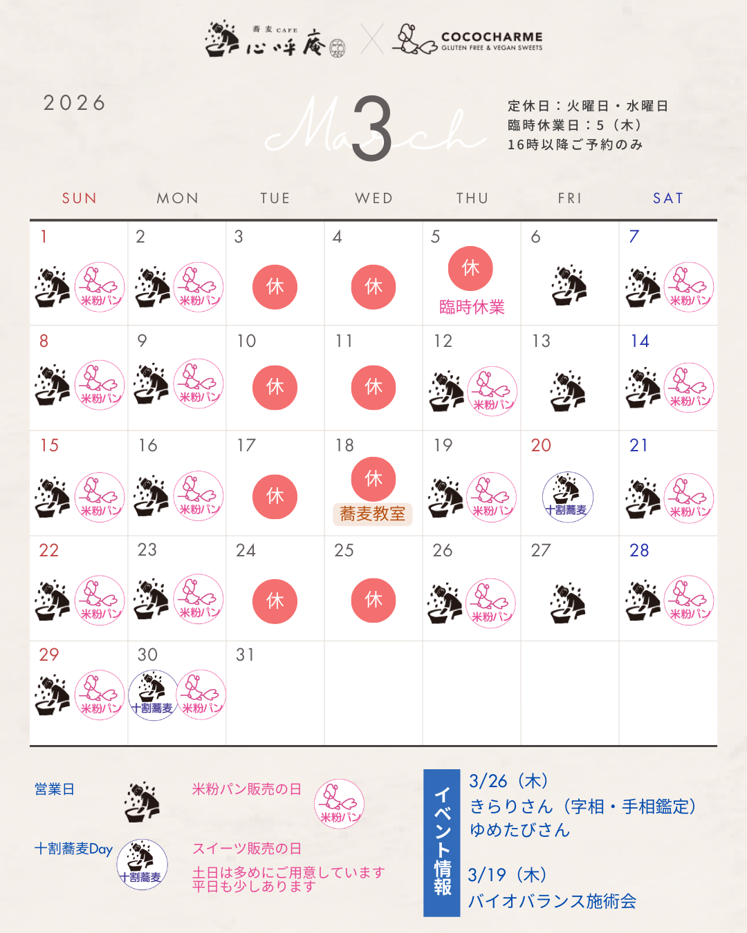 2. 2026年03月の十割蕎麦DAYは、20日(金)・30日(月)に実施します。