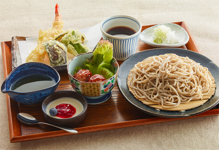 海鮮と野菜の天ぷら盛り合わせorミニ天丼、お蕎麦(かけ蕎麦、または盛り蕎麦)のセット、小鉢・小デザート付き